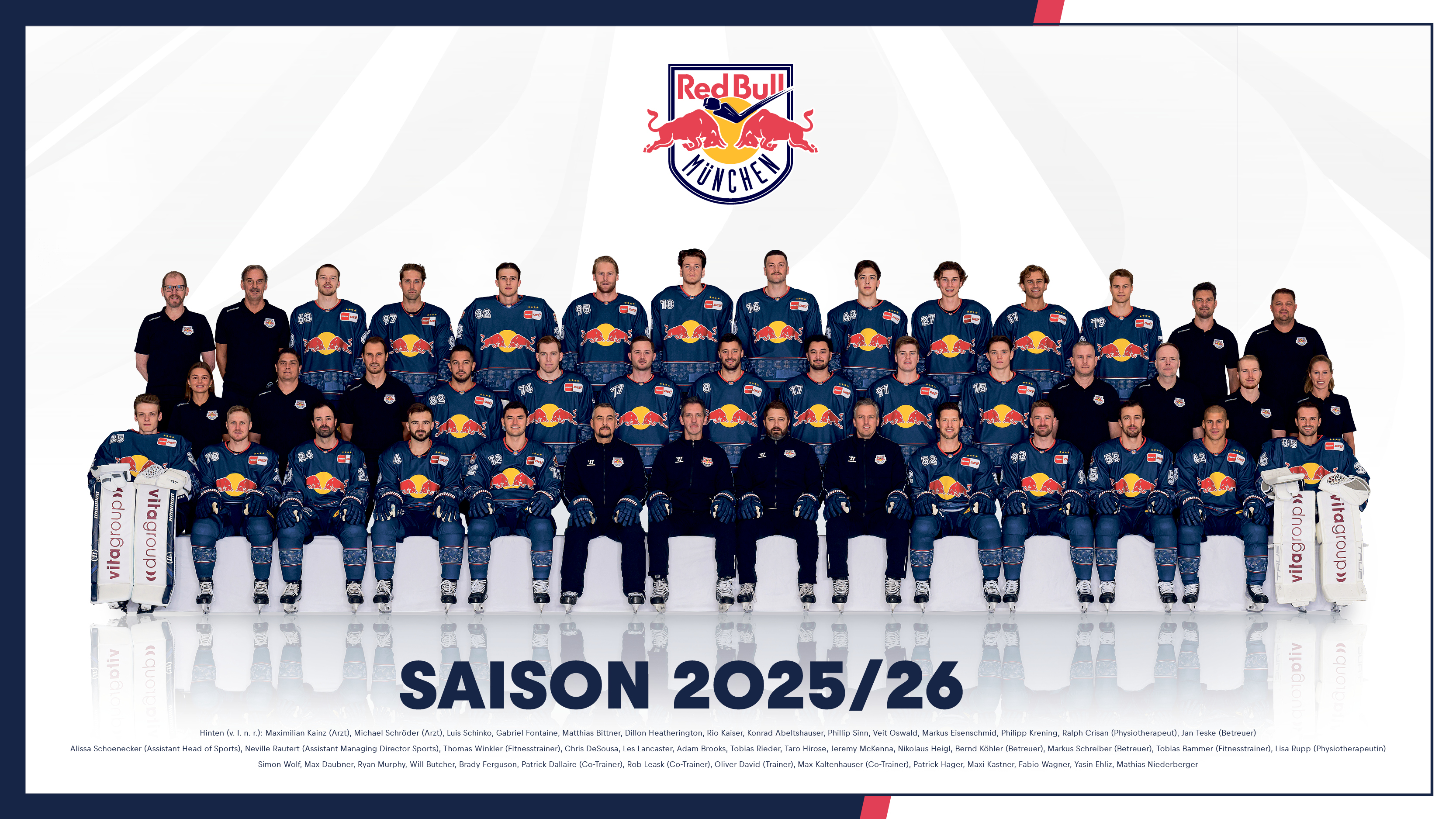 Mit auf dem Teamfoto des viermaligen deutschen Meisters sind neben dem neuen Cheftrainer Oliver David sowie dem neuen Co-Trainer Rob Leask alle elf Neuzugänge der Red Bulls. Im brandneuen Trikot sind entsprechend auch Torhüter Matthias Bittner, die Verteidiger Dillon Heatherington, Rio Kaiser, Ryan Murphy, Phillip Sinn und Fabio Wagner sowie die Stürmer Brady Ferguson, Gabriel Fontaine, Philipp Krening, Jeremy McKenna und Luis Schinko erstmals im Trikot von Red Bull München zu sehen.
