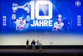 Frank Mauer, Ex-Kapitän Michael Wolf, Christian Winkler ( Managing Director Sports Red Bull Eishockey), unsere aktuellen Spieler Koni Abeltshauser und Maxi Kastner sowie drei besondere Überraschungsgäste ließen diese so wunderbaren Momente bei einem Meisterdinner noch einmal aufleben.
